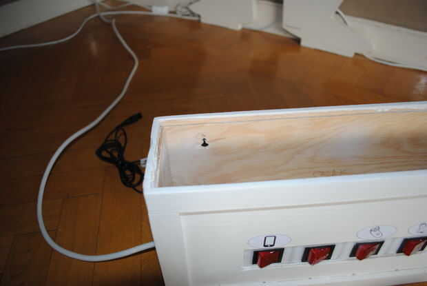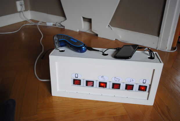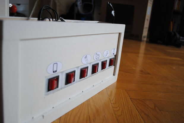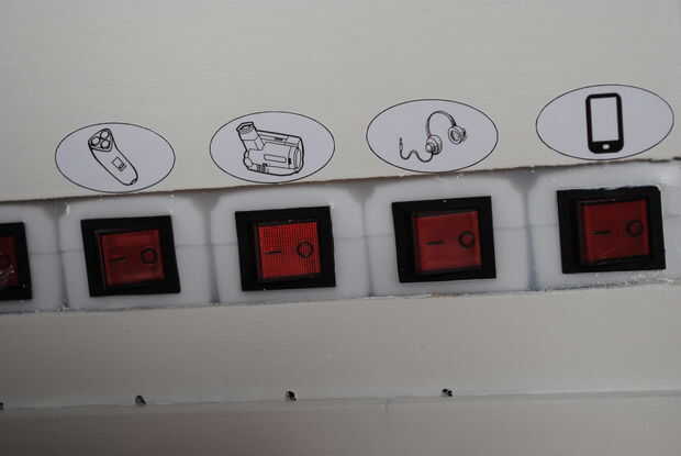 Para que sea fácil ver qué interruptor tengo que activar para cada cargador, imprimí algunas fotos en papel adhesivo y pegado encima de cada interruptor. También hice algunos agujeros en la parte posterior para poder colgarlo en la pared.