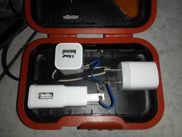 Ahora los cargadores Usb debe ser conmected uno al otro y si havnt conmected el cable de alimentación ahora es el momento para eso. Para mi caja usé mi arma de la soldadura para fundir un agujero a través del perfecto de lado para mi cable ir a través. También utilizo este método más adelante para hacer los agujeros para los conectores USB conectar a través de. Por favor tenga cuidado al hacerlo porque el plástico de la fusión puede producir humos tóxicos y hacerte enfermo o mareado. Esto se hace mejor fuera o en mi caso ya que es de-15 grados hacia fuera lo hice cerca de una ventana abierta y encendí una vela para enmascarar el olor a plástico.