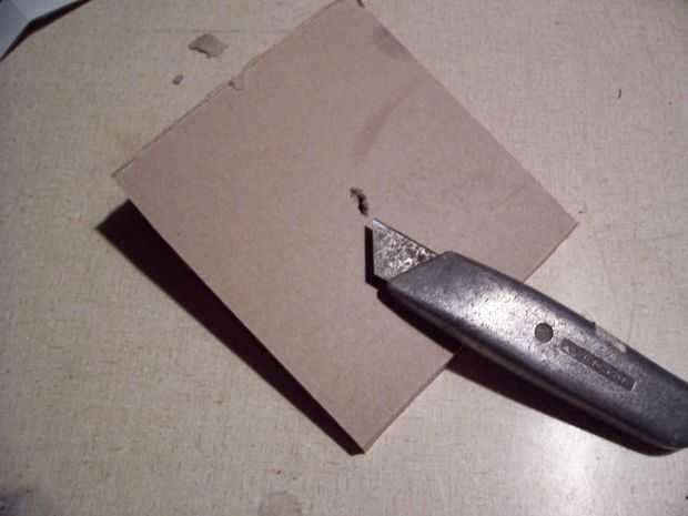 punción un agujero en el centro de la caja de cartón (aquí irá una cosita de latón) Asegúrese de que usted hace otro justo enfrente de él.