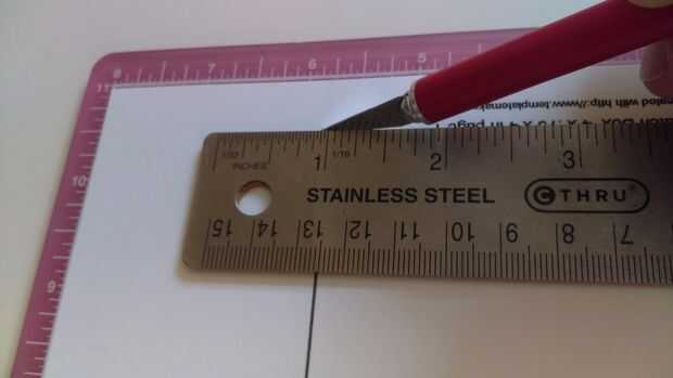 Para cortar la plantilla hacia fuera, coloque la impresión en la superficie de corte y la línea de la regla contra una de las líneas de la plantilla. Tenga cuidado con esto para asegurarse de que se alinea con la mayor precisión posible. Luego use el cuchillo para cortar a lo largo de las líneas, presionando firmemente contra el papel y la regla. Necesita mantener presionada la regla con la otra mano para asegurarse de que permanece en su lugar. Si la sierra no corta a través de la primera vez, sólo repetir el corte. El corte parcial habrá dejado un surco en el papel, así que debería poder ejecutar solo la hoja que para profundizar el corte.