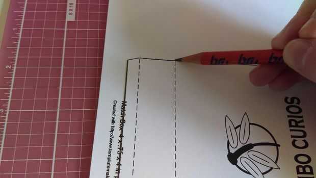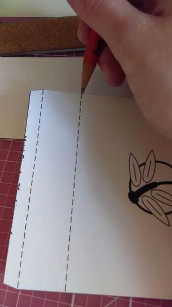 Para la parte inferior de la caja podría simplemente plegar en las líneas de doblez, pero si hiciera lo mismo para el manga, el diseño impreso terminaría en el interior. Así que necesitaba anotar a lo largo de la parte sin imprimir del libro, lo que necesitaba para marcar donde las líneas debe ser. Una manera de hacer esto es utilizar la parte sobrante de la impresión como guía, si sigue intacta. Línea la pieza cortada contra él, y luego marcar en el papel donde están las líneas de doblez. Una vez que voltee la pieza cortada, puede utilizar las marcas para, donde al menos un gol. Alternativamente, puede tomar un lápiz, mantenga la pieza cortada para arriba con la parte impresa mirando hacia usted y marque cuidadosamente detrás de él. Entonces la puntuación a lo largo de esas marcas. De cualquier manera, una vez que el papel se anotó, luego doblarlo.