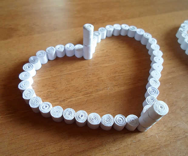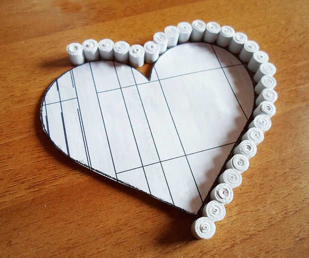 Ahora hacen muchas bobinas apretadas blanco con la herramienta quilling y pegarlos uno al lado del otro alrededor de su forma de corazón (noen él!).