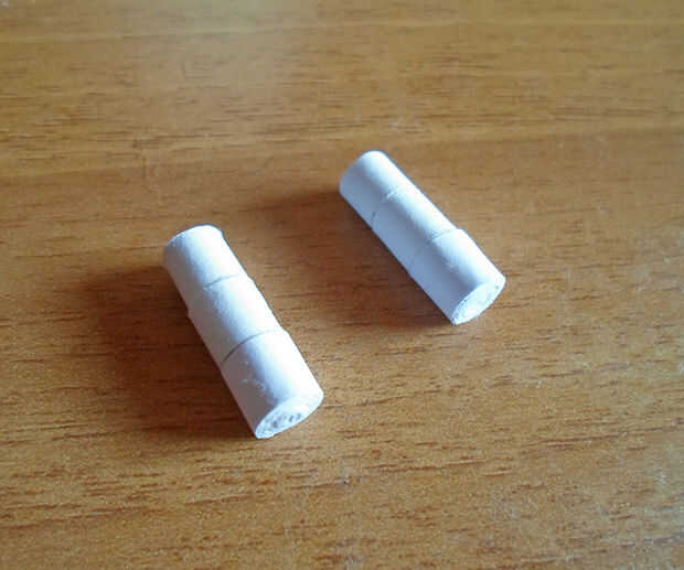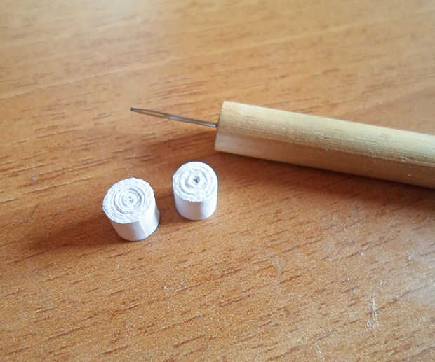 Por último, hacer 6 bobinas apretadas blanco más. Pegamento 3 encima de la otra y lo mismo con los otros 3 para obtener 2 "columnas".