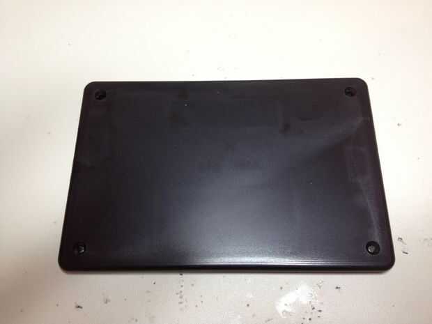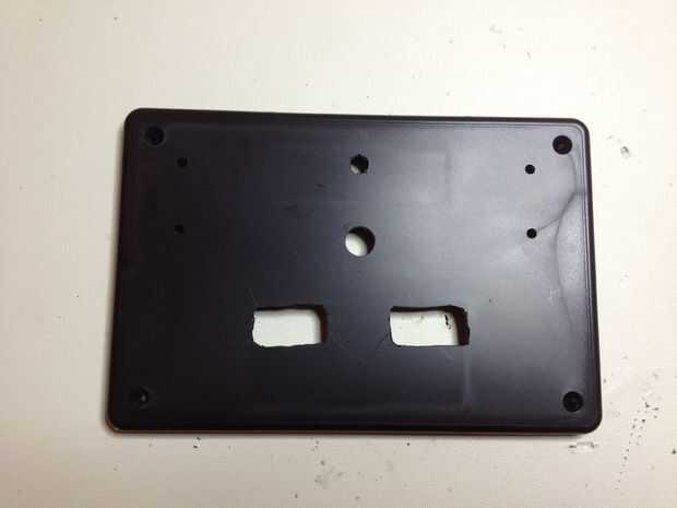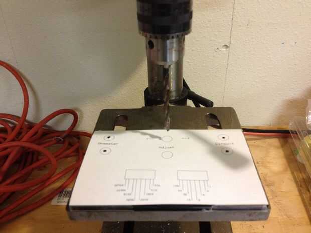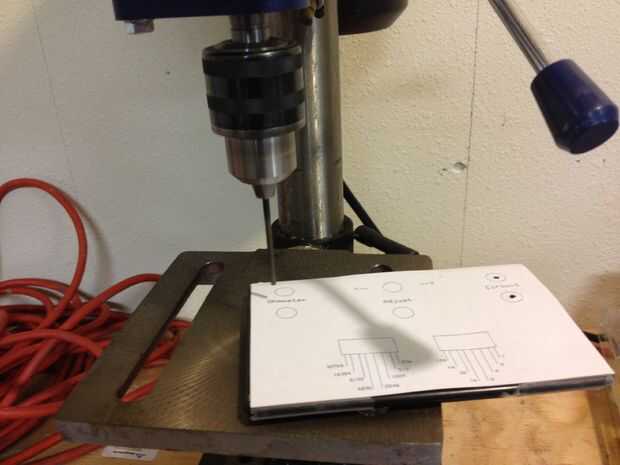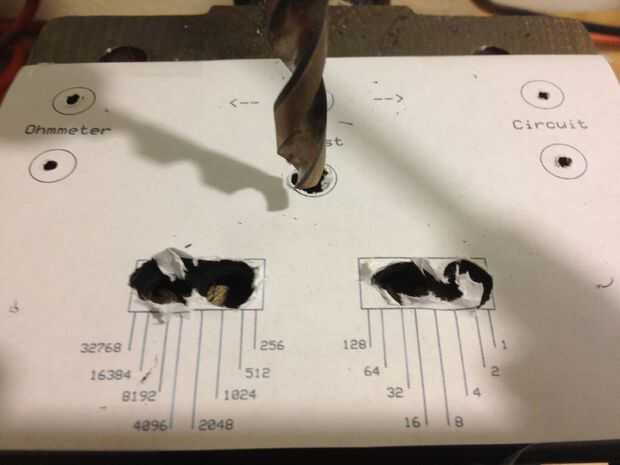 Hacer un primer dibujo de la placa frontal sobre papel y cinta adhesiva a la tapa de la caja de plástico para que pueda perforar y cortar la tapa según sea necesario. Limpieza luego el DIP interruptor de aberturas con una Dremel o un archivo.
