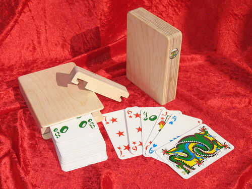 Cuando primero yo estaba empezando mi viaje hacia el hobby de juegos de tablero entré en el sitio boardgamegeek. Un día me topé con wolfzell y sus proyectos de carpintería. Había hecho una pequeña caja de madera para sostener las tarjetas. Publicado fotos y me enviaron mensajes de ayuda, aunque no tengo las herramientas para hacerlos. La imagen de arriba es uno que hizo y que primero me llamó la atención. Pasaron años y desafortunadamente falleció en 2013 y sólo tiene las herramientas para hacer unas cajas y decidido como mi primer proyecto de trabajo de madera sería en su honor y crear algunos cuadros de uno de mis muchos juegos de mesa. Él utilizó una sierra de calar con una sierra de banda así que tuve que modificar el diseño. Pero sigue con el mismo espíritu.