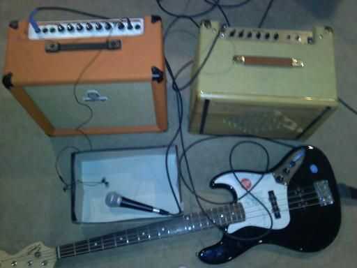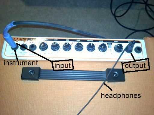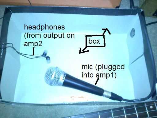 Para hacerlo necesita: 2 amplificadores, una guitarra, 1/8 a 1/4 adaptador, una caja de zapatos, auriculares y un micrófono