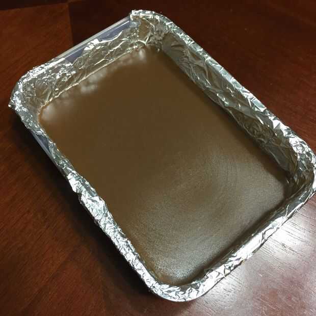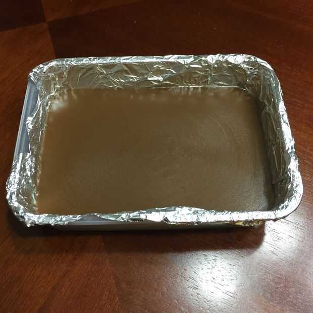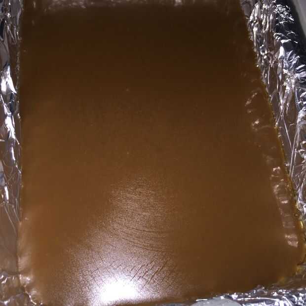 El Tupperware solía verter el caramelo en era muy pequeño, 6 "x 8". Terminaron siendo aproximadamente 1/2" de grosor que era perfecto para mí.