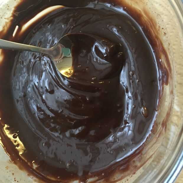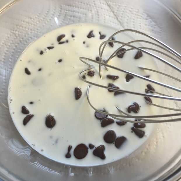 Calentar la crema de leche hasta que hierva apenas. Vierte sobre las pepitas de chocolate en un bol. No revuelva. Dejar reposar 5 minutos con un plato o tapa en la parte superior. Luego revuélvalo juntos suavemente hasta combinar bien. Refrigere por 4 horas.