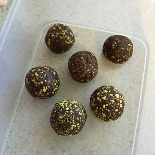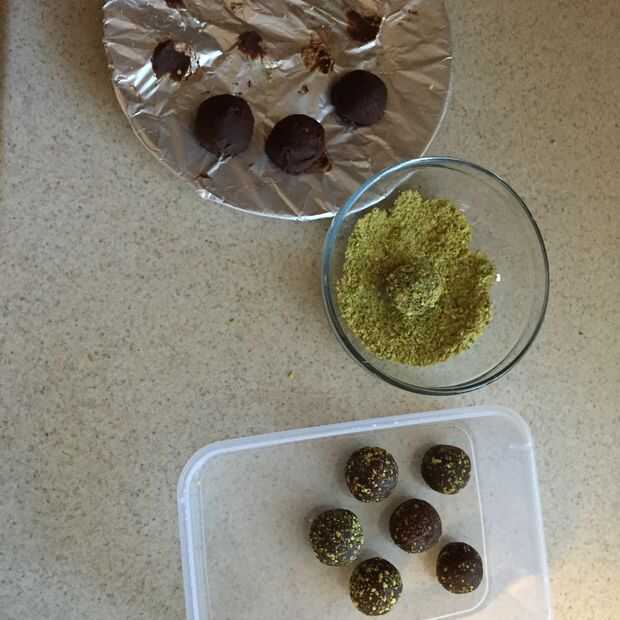 Después de que se ruedan Lávese las manos y luego rodar cada uno en la mezcla de nueces. Rodar las bolas otra vez en sus manos para presionar las tuercas en. Poner en el congelador o la nevera hasta que esté listo para mojar en el chocolate.