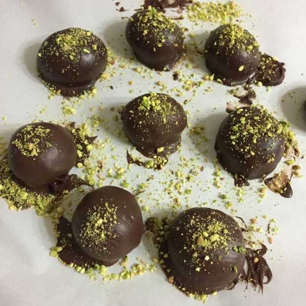 Fundir el chocolate y mojar cada una con un tenedor para separarlas hacia fuera. Toque en la horquilla en el tazón de fuente para bajar el chocolate sobrante. Espolvorear la parte superior con los pedazos más finos de pistachos picados.