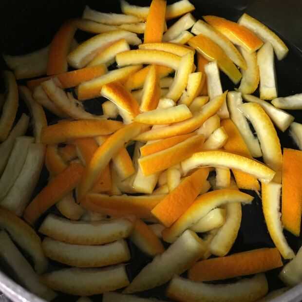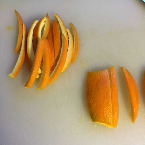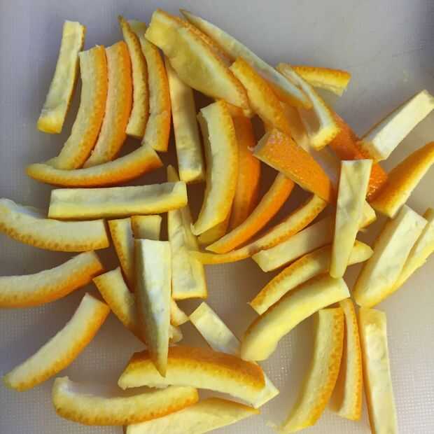 Primero prepare sus cáscaras. Cortar las naranjas en cuartos. Entonces separar la piel cuidadosamente. Cortar la cáscara en 1/4 de pulgada pedazos. Cortar éstos por la mitad por lo que encajaría muy bien en mis envoltorios de golosinas.