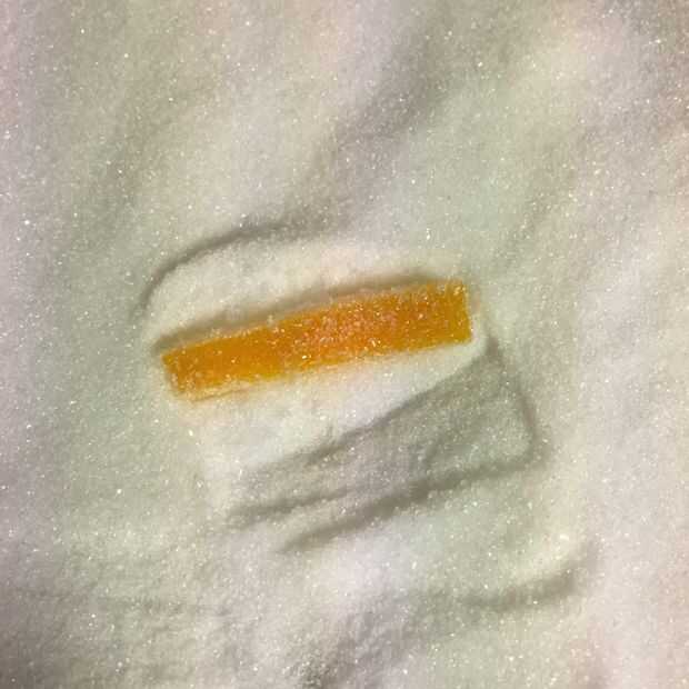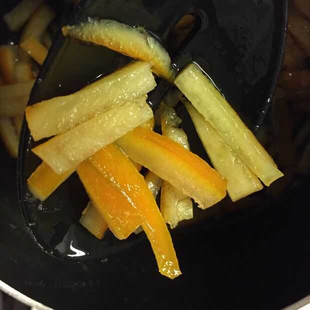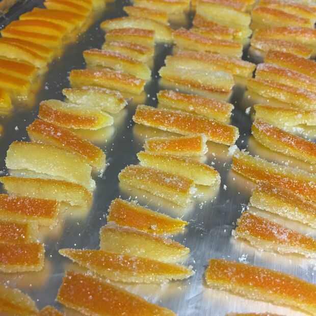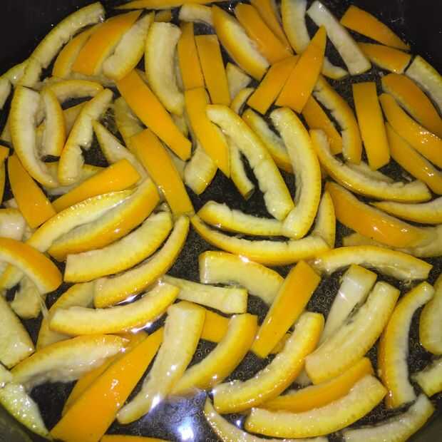 Poner el azúcar y el agua a hervir. Hervir hasta que la temperatura alcanza los 300 grados. Agregar luego las cáscaras para el jarabe. Cocinar durante 30 minutos hasta que las cáscaras son translúcidos y muy bien glaseadas. Retirar y dejar secar durante 2-4 horas. Si quieres rodar en azúcar como hice yo recomiendo esperar al menos 4 horas. Serán lo suficientemente pegajosos para recoger el azúcar pero sin grumos.