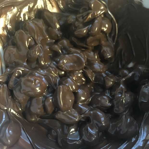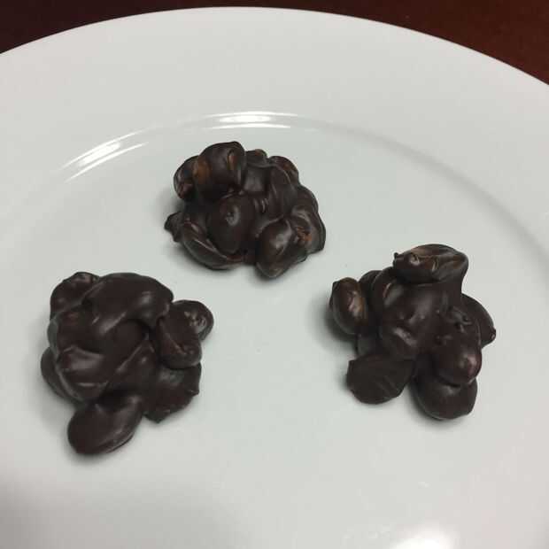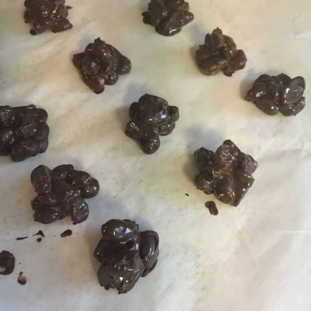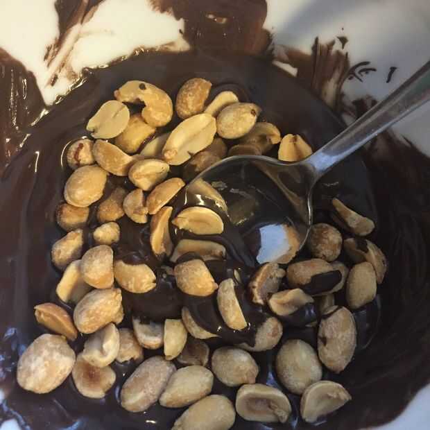 Fundir el chocolate y añadir los cacahuetes. Revuelva bien para recubrir uniformemente todos los cacahuetes. Scoop pequeños racimos en papel de pergamino.