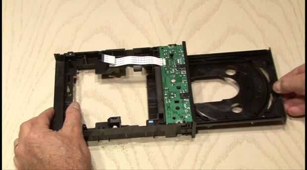 2. Retire la placa de circuito en la parte posterior de la unidad por encajándose a presión hacia fuera y desconectar los cables de cinta. Aferrarse a la Junta como se va detrás el final.