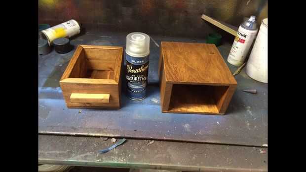 Después de que la caja está manchada, recoger la capa transparente que le gustaría utilizar. Usé un poliuretano spray puede borrar capa porque sentía que podría funcionar mejor para mi proyecto. Yo pondría 3-4 capas de clear en él para asegurarse de que su capa clara es bastante durable.