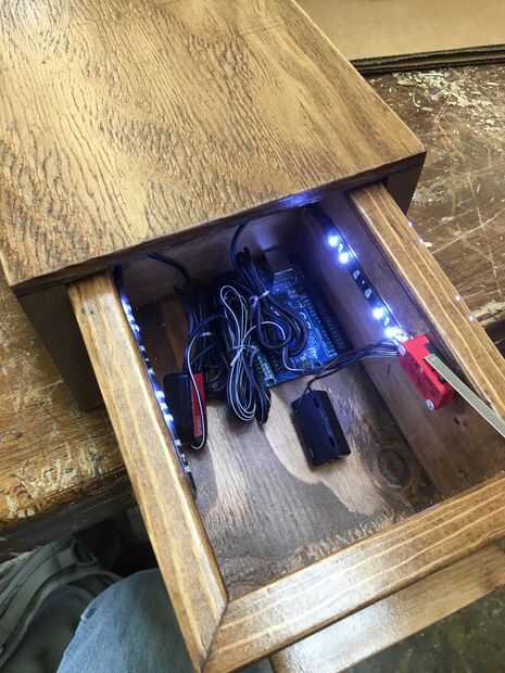 Ahora que el interruptor está conectado y en su lugar debe tener una caja que se enciende al abrir el cajón. El cuadro que he hecho funciona a través de un ardunio pero que no es necesario para este proyecto sin que también lo puede hacer.