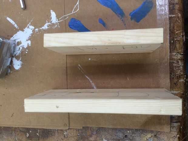 Encontrar unos pies de desecho 2 x 4 tablones de madera y cortar trozos de dos 6 pulgadas y dos de 8 pulgadas. Imagen representa sólo uno de 8 pulgadas y 6 pulgadas pieza.