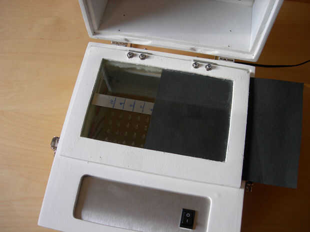 Nota de seguridad! No mire directamente los LEDs UV. La luz ultravioleta es nociva para los ojos. También es una buena idea para conseguir unas gafas láser, estos deben bloquear toda la luz por debajo de 532nm. Para tener una idea de la cantidad de tiempo debe exponer su PCB para que puede hacer una prueba de exposición. Cubra un pedazo de chatarra con foto resistir en un lado y marca de minutos por el otro. Luego con un pedazo de la máscara de la tarjeta del metal exponer durante 1 minuto después de mover la tarjeta a la siguiente, marca exponer durante otro minuto y continuar hasta llegar al final. Recuerde que desde la marca de 10 minutos y abajo.