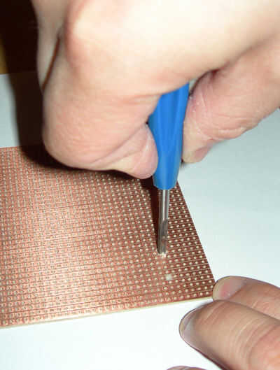 Primero cortar las pistas con un cortador de cara de punto según el diagrama de la pista y taladrar los 6 agujeros (3.2 mm). Buzz las pistas con un polímetro en cada etapa para comprobar cortocircuitos y conexiones en mal estado.