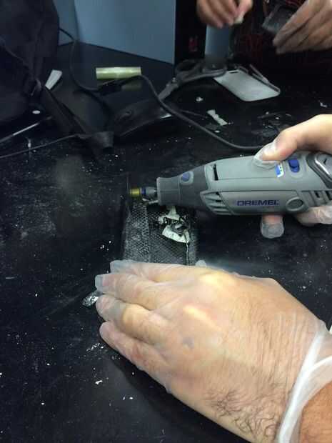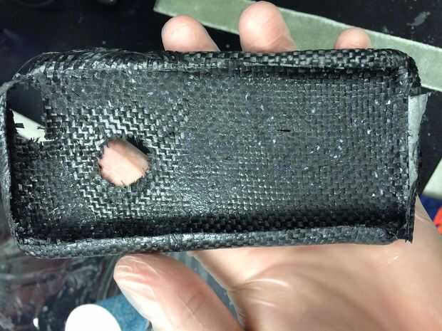 En este punto, pasa nada si su caso aún se ve un poco desordenado porque ahora es el momento para que se vea bonito. Recomiendo usar un dremel y tijeras de corte de fibra de carbono si es posible. Se cortar los bordes de su caso de fibra de carbono en cualquier medida prefiere, tratando de deshacerse de cualquier fibras que todavía están flojamente y pliegues. Recuerde dejar suficiente a los lados para que el teléfono simplemente no cae. También cortar cuidadosamente las características del agujero que podría tener su caso como el anterior.