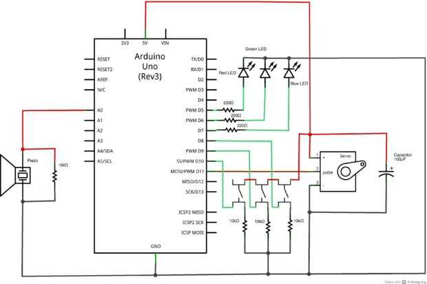 Este proyecto muestra un diseño de un circuito simple y una caja que puede ser desbloqueada utilizando un golpe específico. El circuito consiste en un Arduino uno, un micrófono, LEDs y un servo motor. La caja se puede hacer con su propio diseño y cre
