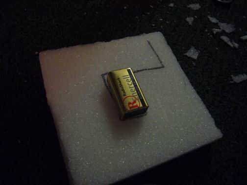 Ahora toma una pluma y mermelada un agujero a través de la espuma de poliestireno de la parte delantera a la parte posterior. cerciorarse de que el agujero del suficientemente ancha como para pasar el conector de la batería.