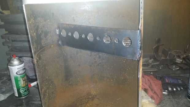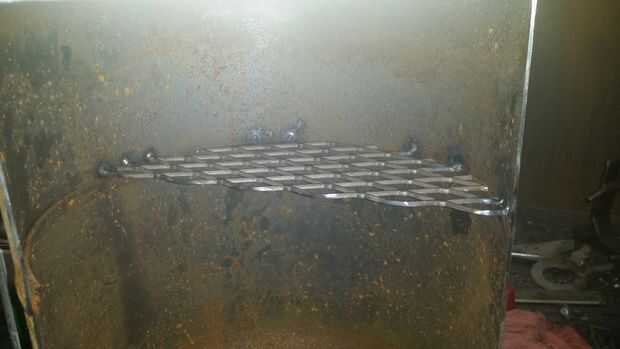 Como con la puerta agregué un estante de acero extruido. También usé costura existente como soporte. He añadido una tira de acero al frente de la repisa con un montón de agujeros taladrados en él para que pueda ver lo que está en la plataforma ya que es difícil ver en.