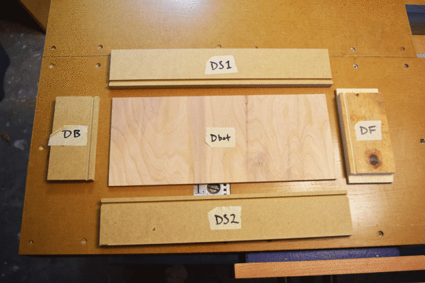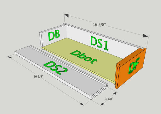 Un 1/4" de ancho y 1/4" profundidad dado se corta 1/4" de la parte inferior de las piezas de MDF y pino. Se utiliza una pieza de contrachapado de abedul 1/4" para el fondo del cajón. Utilice la pieza de madera contrachapada de Bot para alinear todas las piezas, hay un descuento del corte en el frente del cajón (DF) ver dibujo para las mediciones. Uso la misma técnica para mortajas de corte en una mesa de sierra para cortar este descuento; Use el calibre de ingletes para asegurar un corte que es cerca de 90 grados.