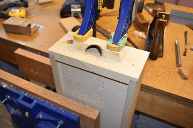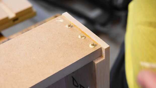 Poner pegamento las caras MDF y pino que se reunirán, poner unas gotas de pegamento en el dado en lugares donde la madera de la parte inferior se deslizará en. Fije todo a otra, compruebe que es cuadrado, deje que el pegamento seco, luego prender las piezas. El fondo de madera contrachapada se cubrió al lado sólo en el centro. No se trata de una construcción de cajón ideal, pero es fácil y debe durar mucho tiempo con un mínimo cuidado.