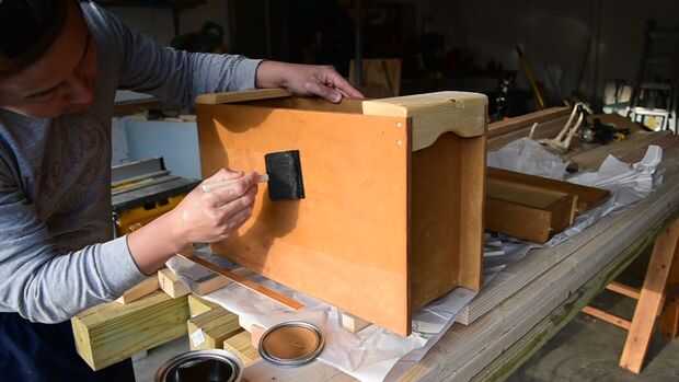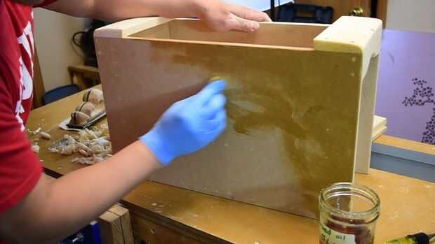 Refinar la forma mediante la eliminación de todos los filos con archivos y papel de lija, hasta que no coge la mano. Cualquier cara que sobresale ahora debe ser recortado/cepillada/o lijada al ras con la caja. Lija de grano 320. Aplique una capa de aceite de linaza, esta va a oscurecer y mejorar el aspecto del MDF.