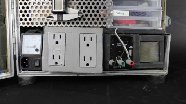 - Powerstrip casero con GCFI • un GCFI es un dispositivo de salvamento que mide la potencia y asegura que 100% se está regresando a través del tapón. Si la salida es mayor que el retorno, apaga, potencialmente salvar su vida si su carnoso cuerpo salado es el puente a tierra. Tiene 4 salidas en la parte frontal de la caja y 3 detrás del soldador, el cargador de baterías Milwaukee M12 y la fuente de alimentación variable.