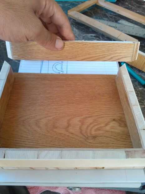 Inglete corta cuatro pedazos de 2cm de altura para formar el cuadro. Pegamento o tornillos. Hice ambos. Retire cualquier exceso de pegamento. Asegúrese de que los granos estén dentro. Dará estéticamente mejor aspecto final.