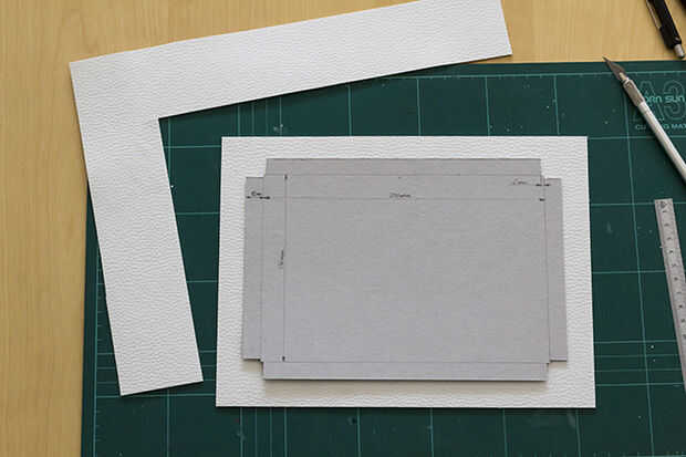 Cortar el cuero artificial un poco más grande que el cartón y pégalo en la cartulina (por debajo de los bordes del pegamento).