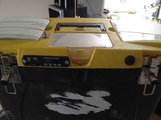 uno de los compartimientos se convirtieron en la batería, el otro un usb estación de carga. el killswitch principal está en la parte superior, el interruptor de Bluetooth junto con el módulo mp3 están en el frente de la tapa y los altavoces se montan en uno de los extremos de la caja en cuanto a espacio interno. los altavoces están protegidos internamente por un marco de madera, acabado con láminas de plástico muy gruesos