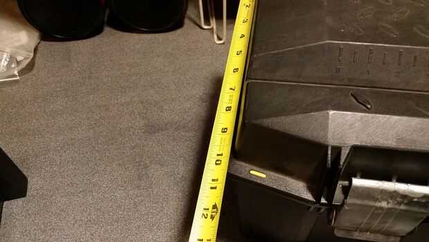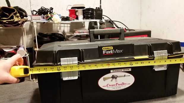Para este caso usé una caja de herramientas de Stanley FAT MAX 28 pulgadas comprado en Lowes, están bien construidos, tienen bisagras de perno de metal y son muy durables (tienen 3 y ganarles hasta bastante bien) Dimensiones exteriores son ancho por alto por 11inches profundo 12inches 28inches. Cualquier caja de las dimensiones anteriores probablemente trabajaría.