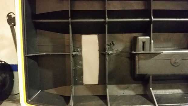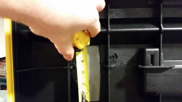 Otra vez es necesario algún ensayo y error pues cada uno vio voluntad difieren. En algunos casos puede no necesita cortar en absoluto. En este caso necesitaba cortar piezas de red de apoyo y hacer un agujero en la tapa para que la manija de seguridad claro para permitir que la tapa cierre.