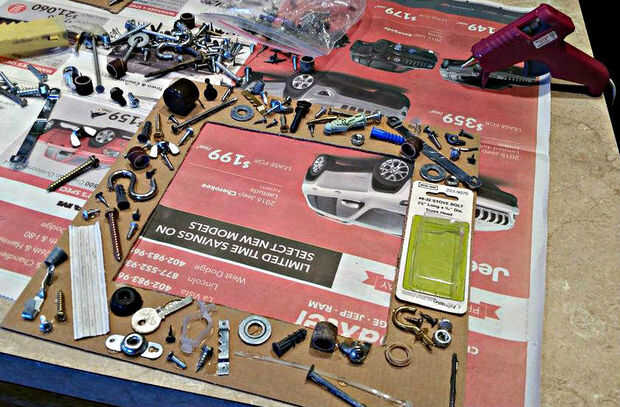 Poner marco de cartón en periódico y una vez que el arma de pegamento se calienta adecuadamente, comenzar pegando «tesoros» en el marco de cualquier manera que usted elija.