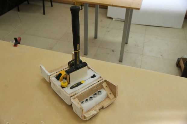 esto es un portador de herramienta que construí para mis herramientas de mano.  La idea es que cada herramienta tiene un lugar designado y que nada más cabe en la caja.   El diseño le permite hacer un inventario completo de su caja de herramientas en