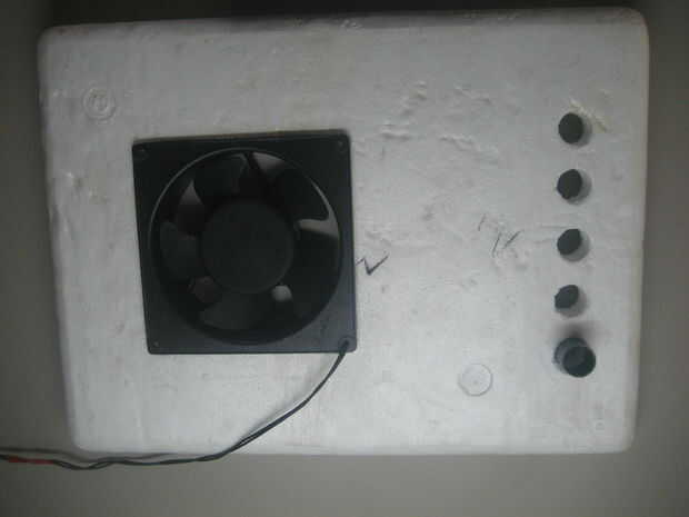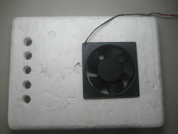 El agujero para el ventilador puede recortar usando una cuchilla. Sin embargo si usas una caja gruesa como la mía, usted tendrá problemas cortando los agujeros de una tubería con la hoja, así que decidí el corte los agujeros utilizando el tubo sí mismo por un poco afilado uno de sus bordes. Esto hace el trabajo fácil.