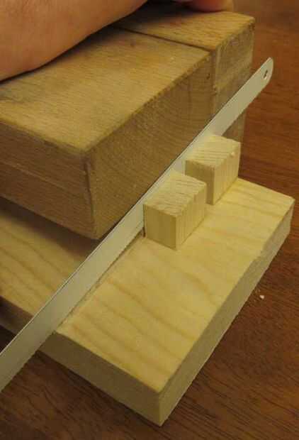 Usar más piezas de madera para alinear una hoja de sierra a la caja de ingletes y hacer un surco de la hoja.
