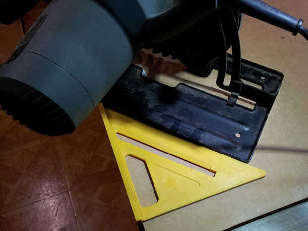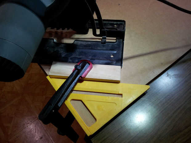Con su rápido giratorio cuadrado su sierra alrededor hasta que es en un ángulo de 45 grados en el borde de trabajo de tu MDF. Poner otro bloque de pino de madera contra la placa del pie de la sierra en el otro lado a la primera cuadra de la parada. Sujete en su lugar y compruebe que todavía está en 45 grados en su borde de trabajo y el tornillo en su lugar.