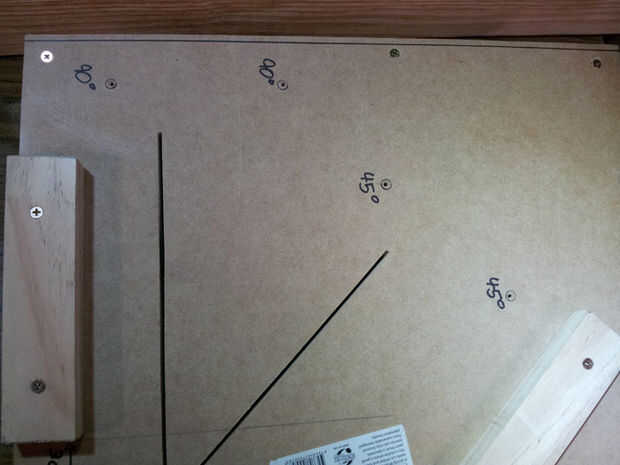 El primer pino me ayuda simplemente escuadra con el borde de trabajo del MDF, doble comprobar insertando un trozo de metal en la ranura de corte de 90 grados (y comprobada con la Plaza rápida) y se atornilla en lugar. Avellane las cabezas de los tornillos en cualquier lugar donde puedan entran en contacto con la placa de pie Sierra para evitar que se dañe. No tomar una foto de esto (aunque debo tengo).