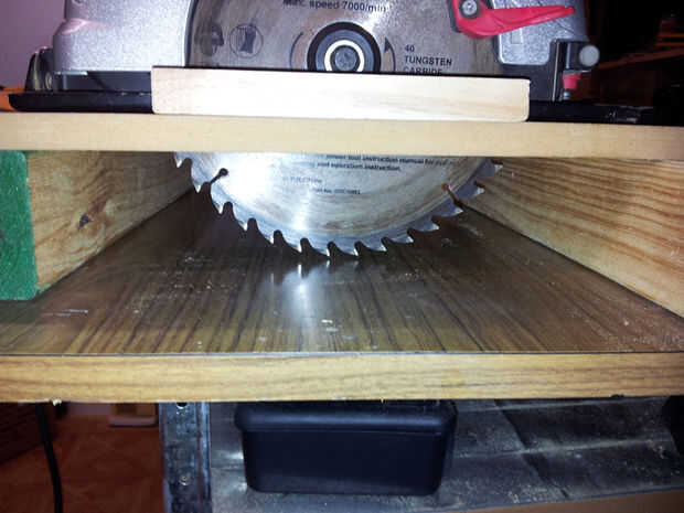Antes de colocar la segunda viga de pino configurar la caja sobre mi superficie de trabajo (descanso en la segunda viga de pino), ajuste la sierra a su posición perpendicular cortado y había echado un vistazo a cómo estaba sentado. Como se puede ver en la primera foto tuve la otra vez suerte en que los soportes de pino son lo suficientemente altos como para que mi disco no golpee la superficie debajo. Esto significa que no necesita preocuparse demasiado profundo hundiendo cuando realizo cortes.