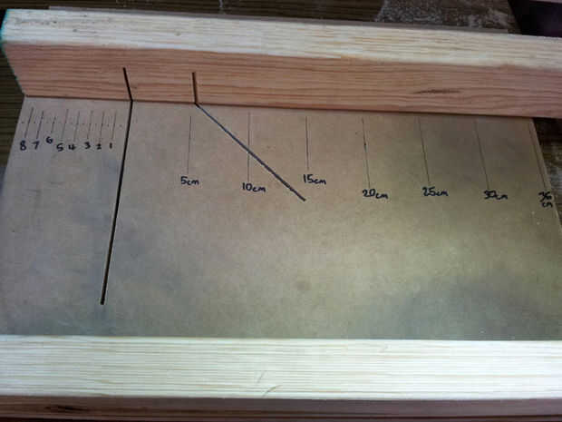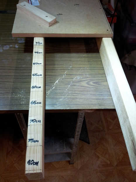 a partir de la parte inferior de la hoja MDF, usted puede hacer mediciones áspero cortadas rápidos. Empezar a marcar desde el borde más cercano de la ranura de la cuchilla y marque nuevamente. Elegí en la dirección principal a la marca en incrementos de 5cm de la hoja. Mientras que en el MDF solo marqué la cara plana, una vez más allá del borde del MDF marqué en la viga de pino, para toda la longitud (aproximadamente 80cm de la hoja). En el lado secundario más corto de la hoja marcados incrementos de 0,5 cm, otra vez midiendo desde el borde más cercano de la ranura de la cuchilla.