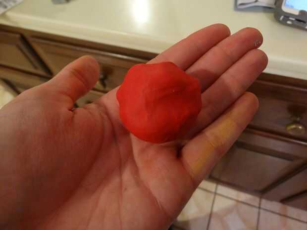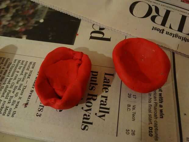 Utilice la arcilla para crear 2 mitad esferas de arcilla. Asegúrese de que el exterior de las esferas esferas la mitad es de color rojo