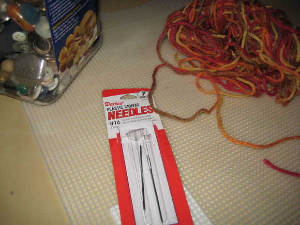 Hilado (generalmente uso rojo corazón para mis proyectos porque no es demasiado fina y para la mayoría de mis proyectos, no importa cómo suave o mullido el hilado es, también, si es demasiado esponjoso es difícil de usar. He probado el hilado casero y era demasiado grueso para ir a través de la lona plástica).
