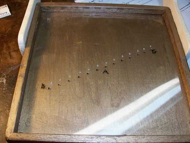 Perforaciones de anclaje en la superficie del resonador como se muestra.  Nota 'A' está sobre centrado en la parte superior de la zona de la caja como se muestra. Espacio son 0,4 pulg.  utilizando la herramienta Dremel y taladro de 1/16.  Tol.  es =-1/32 en.