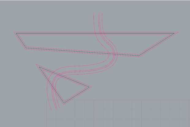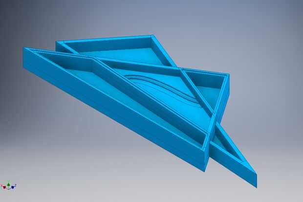 Mi papel de dibujo tiene un número de triángulos superpuestos, pero después de recorrer un par de veces en Rhino, aterricé en este diseño básico: dos triángulos que se cruzan. Entonces creé la altura y el espesor. La parte inferior de la bolsa del centro es la misma altura que las paredes exteriores del triángulo más delgada. I valor booleano-ed rebajos para las tapas y bolsillos poco profundos para las incrustaciones. Pasé la línea curva que cruzaría los dos bolsillos quería tapas para y definir una forma agradable para tiradores poco.