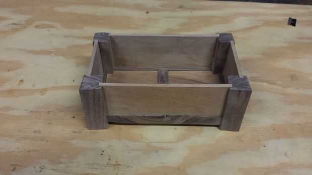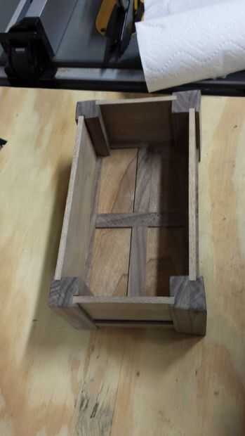 También decidí añadir algunas florituras de nuez al fondo fuera de los bordes y en el interior de la base de la caja. El perfil del borde exterior se logra cortando al hilo un 3/4" pieza cuadrada de la nuez a una profundidad de aproximadamente 5/8" y un espesor de 1/8" a lo largo de dos caras. El acabado interior es simplemente 1/8" trozos gruesos. Estas pueden todo fijarse con pegamento.