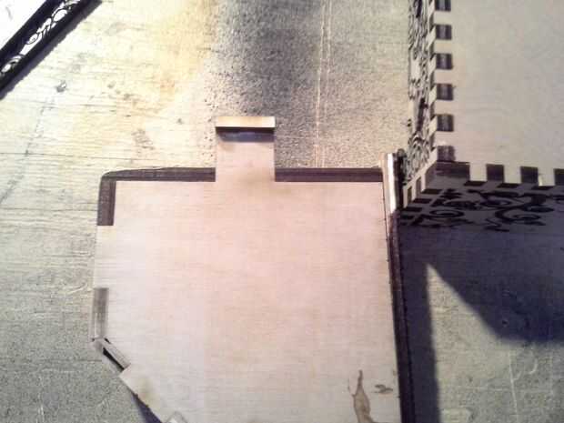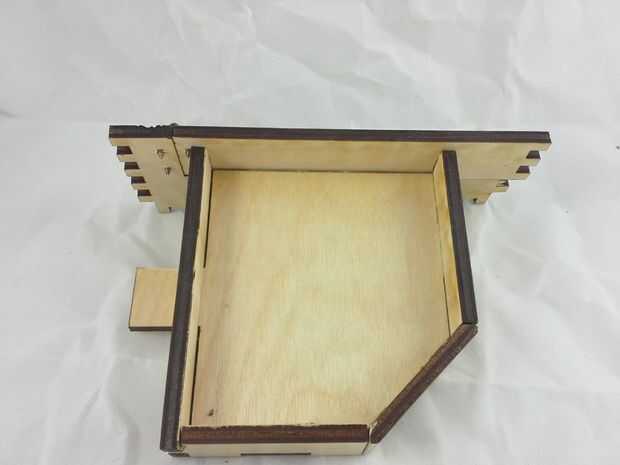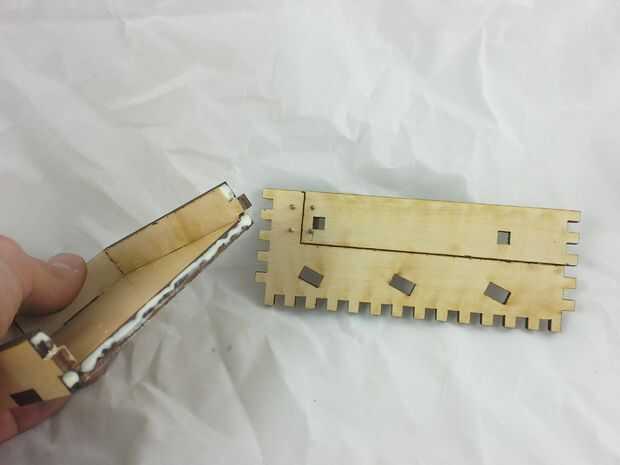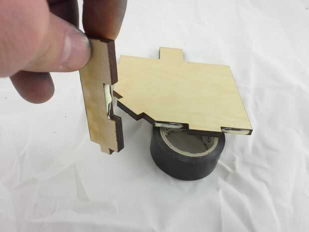 A continuación, sujete los lados de la gaveta a la base principal. Cada lado debe tener una ficha que se pega hacia fuera la parte posteriora que se utilizará para fijar el cajón al lado con bisagras. Cuando usted necesita conectar la pieza ángulo frontal del cajón, necesita pulir cada esquina posterior en orden para que ajuste. Una vez que cada esquina lijar lo suficiente, agregue algunos cola de carpintero a la pieza y en lugar. Usé un pequeño toque de pegamento en cada parte para ayudar a mantener en su lugar mientras seca el pegamento de madera.